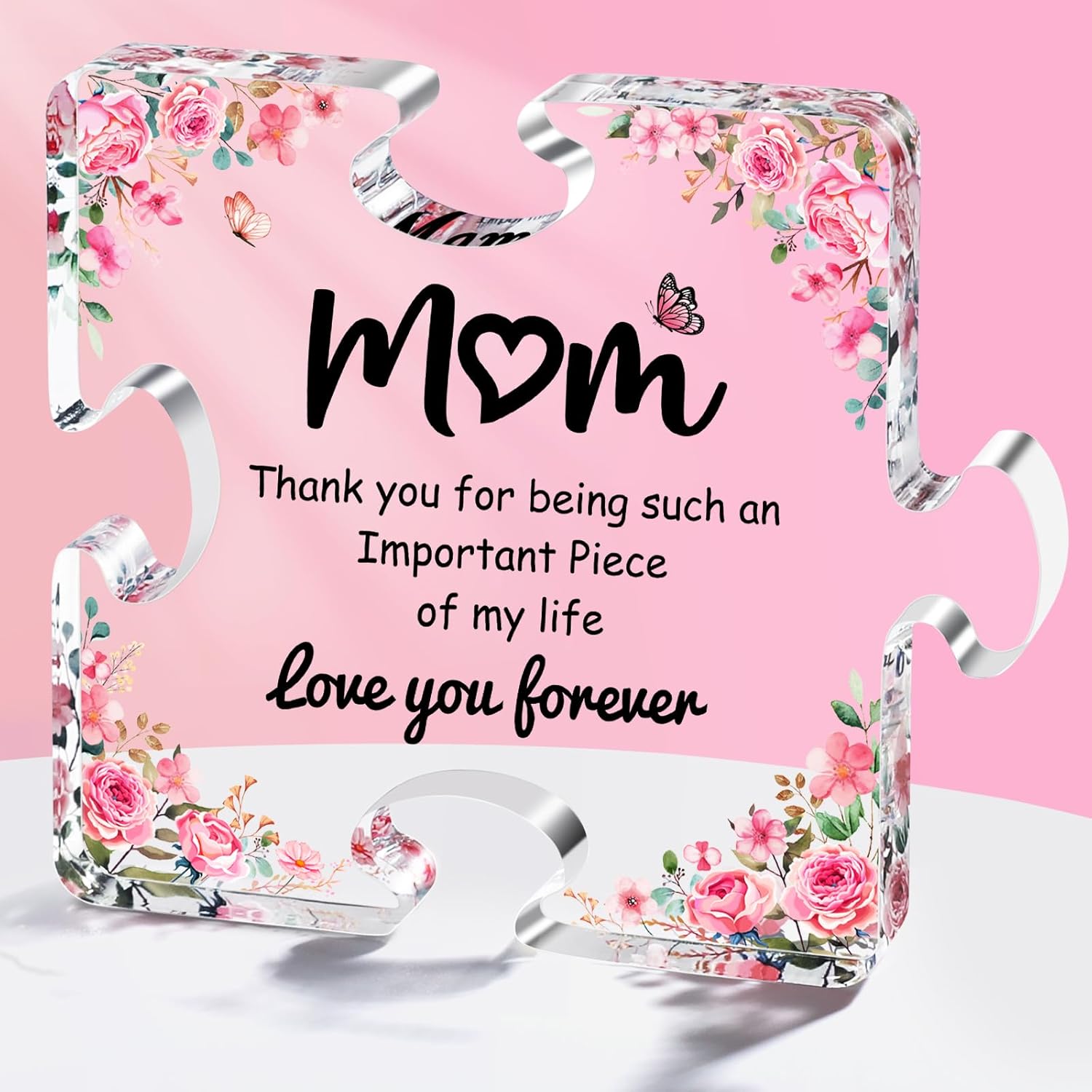 • Valentines Day Gifts for Mom:The pink flowers and butterflies on this gift show that mom will always have a pink heart, and the kind words "Mom Thank you for being such an Important Piece of my life" on the gift combined with the unique appearance of the puzzle piece will make it as Valentines Day gifts for mom. Another phrase on the gift, "love your forever", will also make mom feel your endless love for her at Valentines Day .