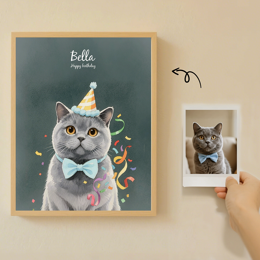 Celebrate your furry friend’s special day with a one-of-a-kind custom pet portrait! Simply upload your favorite photo of your cat, and we’ll turn it into a beautiful, lively birthday artwork—complete with festive hats, colorful confetti, and your pet’s name.