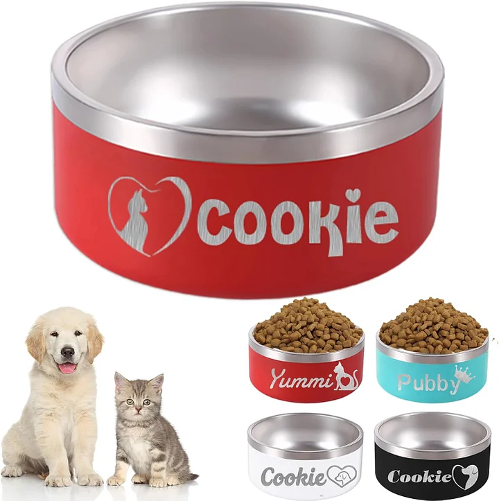 Personalized Dog Bowl: Bowls with names for dogs and cats, using laser engraving technology to engrave names back onto the feeding bowls that never disappear. The dog bowls come in 4 colours: red, black, white, blue, and 16 styles for you to choose and match.